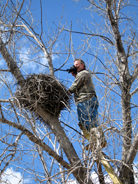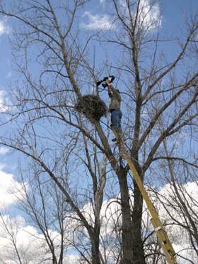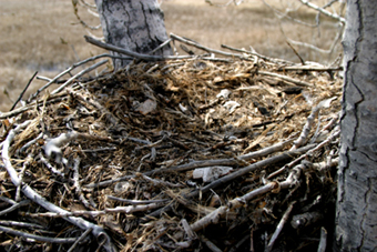 With further investigation of our Owl's nest we discovered it has no eggs and has been abandoned. We speculate the Owl in the nest on April 15,07 was the last of this years brood since Great Horned Owls start nesting in February.